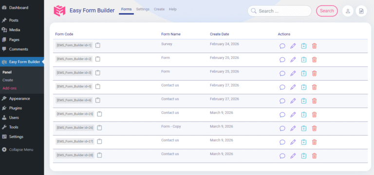 يمكنك إنشاء النموذج من خلال الانتقال إلى Create page، ثم اختيار Survey Forms، وبعد ذلك إضافة الحقول بالسحب والإفلات، ثم حفظ النموذج، ونشره باستخدام الشورت كود أو عبر بلوك Easy Form Builder داخل Gutenberg أو Elementor.